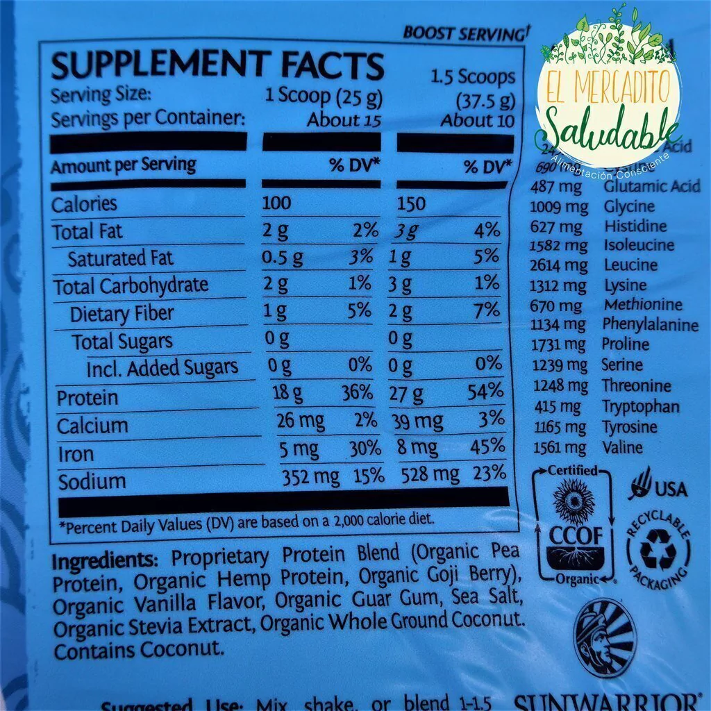 La deliciosa mezcla Warrior Blend es una proteína de origen vegetal que es fácilmente digerible y excelente para cualquiera que desee aumentar su salud y estado físico. Una poderosa combinación cruda muy superior a los ingredientes solos, Sunwarrior Warrior Blend utiliza un proceso único de extracción en frío y tiene un perfil de aminoácidos completo excepcionalmente alto en arginina, lisina, leucina y aminoácidos de cadena ramificada.